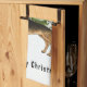 Desteis originelle Cartoon-Illustration eines schwarz-bräunlichen deutschen Schäferhundes. Der Hund ist in einer Winterlandschaft mit drei grünen Tannenbäumen und fallendem Schnee untergebracht. Der Hintergrund ist ein blaues bis weißes Gefälle, das das Design des kalten Wintertages verleiht. Es gibt auch einen personalisierbaren Textbereich, der jetzt lautet: "Frohe Weihnachten!".