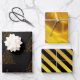 Dieses goldfarbene und schwarze Weihnachtspapier-Set zeichnet sich durch goldmetallische Weihnachtsbäume aus, die alle auf dem ersten Blatt schwarz sind, ein sehr farbenfroh, lebendiges goldfarbenes, goldfarbenes Muster, das auf dem zweiten Blatt goldfarben und goldgelb ist, und im behalt zum Thema Schwarz und Gold ein schwarz diagonal gestreiftes Muster auf dem dritten Blatt. Alle Blätter fügen eine sehr elegante, raffinierte und dennoch festliche Touch zu Ihrem Urlaub Geschenk verpackt in diesem Dezember.