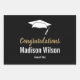Herzlichen Glückwunsch! Ein weißer Graduiertendeckel steht über dem Wort "Glückwunsch". Personalisieren Sie sich mit dem Namen des Absolventen und Jahr der abgeschlossen Klasse. Die anderen Blätter sind schwarz mit einem Muster von weißen Graduierungskappen.
