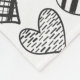 Spielender Katzensprung in einem herzförmigen Ballon, umgeben von verschiedenen gemusterten Herzen in Schwarz-Weiß.