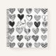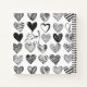 Spielender Katzensprung in einem herzförmigen Ballon, umgeben von verschiedenen gemusterten Herzen in Schwarz-Weiß.