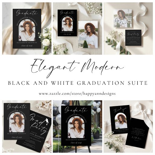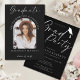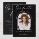 Feiern Sie stolz die unglaubliche Leistung Ihres Absolventen mit dieser eleganten schwarz-weißen Foto-Abschlussfeier-Einladung. Diese stilvolle Einladung zeigt einen schicken schwarzen Hintergrund, schöne Schriftzüge und ein anpassbares Foto Ihres Absolventen. Perfekt, um die Abschlussfeier Ihres Kindes anzukündigen und Familie und Freunde zu einer herzlichen Feier einzuladen. Eine zeitlose und stilvolle Wahl, um den großen Meilenstein Ihres Kindes zu ehren und den Tag wirklich unvergesslich zu machen! Personalisieren Sie mit dem Namen des Absolventen, dem Abschluss, der Universität, den Veranstaltungsdetails und den RSVP-Informationen. Wenn Sie Hilfe benötigen, stehe ich Ihnen gerne zur Verfügung – schreiben Sie mir einfach eine Nachricht!