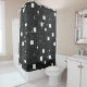 Dieses Bild weist ein modernes, abstraktes geometrisches Muster in Schwarz und Weiß auf. Es besteht aus verschiedenen Quadraten und Rechtecken in unterschiedlicher Größe, die zufällig auf einem schwarzen Hintergrund angeordnet sind. Einige Formen sind massiv weiß, während andere umrissen werden, was einen Schichteigenschaften erzeugt. Kleine Punkte und pixelähnliche Elemente sind überall verteilt, wodurch Tiefe und Textur hinzugefügt werden. Das Gesamtdesign ist minimalistisch und vermittelt eine digitale oder futuristische Ästhetik.