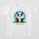 Ein bezaubernder schwarz-weißer Panda-Bär sitzt auf einem frischen grünen Gras und hält einen grünen Bambusstock. Unten ist eine Vorlage, um Ihren eigenen Namen hinzuzufügen, oder Nachricht oder löschen, um leer verlassen.