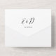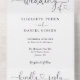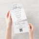 Alles in einer Schwarz-Weiß-Hochzeitseinladung mit eleganten Herz-Schrift-Typografie und Monogramm-Initialen. Die Einladung enthält eine perforierte RSVP-Karte mit Ihrem personalisierten QR-Code für Hochzeiten. Entwickelt von Thisisnotme©