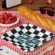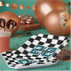 Das schwarz-weiße Schachbrettmuster, das Party der Papiertafel bietet eine Tischdekoration. Überprüfen Sie die Erholung der Auflistung.