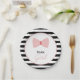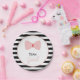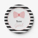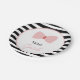 Schwarz-Weiß gestreiftes Geschlecht zeigt Babyduschpapier-Teller. Das Design besteht aus einem schwarz-weiß gestreiften Muster und einem Kreis mit einem rosa Bogen und Ihrem Text.