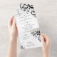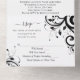 Einzigartige All-in-One-Einladung mit Abreißkarte rsvp. Feierliche und fantasievolle Schwarz-Weiß-Hochzeitsfeiern. Dekorative Wirbel mit Blätter und Rose, schöne Schriftart mit wirbelnden Bändern. Einfache, moderne und klassische, saubere Hochzeitseinladung, mit Ihren persönlichen Hochzeitsdetails.
