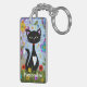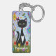 Eine schwarz-weiße Tuxedokatze mit hübschen grünen Augen, rosa Ohren und einem roten Kragen. Sie sitzt an einem hellen Sommertag in einem Garten mit grünem Gras und hübschen farbenfrohen Blume. Um sie herum sind schwebende Blätter und flatternde Schmetterlinge. Am unteren Rand des Schlüsselanhängers in weißer Schrift befindet sich eine Vorlage, um Ihren Namen oder anderen Text hinzuzufügen.