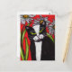 Diese Postkarte hat eine schwarz-weiße Tuxedokatze mit grünen Augen, die vor weißen, dunklen Blume mit grünen Blätter auf einem lebhaften roten Hintergrund sitzt.