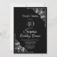 Eine schwarz-weiße Überraschung 40. Geburtstagsdinner mit verzierten Spitzen-diagonalen Ecken, um den weißen Text zu rahmen.