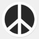 Ein schwarz-weißes Friedenssymbol auf runden Aufklebern.