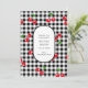 Versenden Sie fröhliche Feiertagsgrüße mit einer karierten Weihnachtskarte in Schwarz-Weiß-Büffel mit spielerischen Kirschfruchtakzenten und festlicher Typografie.