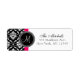 Monogram Wedding Einladungs Rücksendeadresse Label. Copyright Elke Clarke und Lizenzgeber. Schwarz-Weiß-Damast-Muster mit fuchsienrosa Stipe und Kreis-Etikettenschild für Ihren Nachnamen. Passen Sie Ihre Monogramm-Initial-, Name- und Adressdaten an. Wählen Sie auch die Hintergrundfarbe und die Farbe des Monogramms. Copyright Elke Clarke und Lizenzgeber.