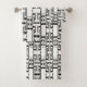Diese auffallenden Badehandtücher zeigen ein zeitgenössisches geometrisches abstraktes Muster von Rechtecken und Quadraten, das an ein ineinander greifendes Labyrinth erinnert