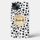 Stilvolles Dalmatiner-Fleckenmuster mit einem Imitat Goldfolienetikett mit individualisierbaren Namen und monogrammatischen Vorlagen. Ein niedliches mit Monogramm iPhone 13 Gehäuse mit schwarz-weiß Flecken Muster und goldenen Elementen. Um die Schriftart-Farben und die Schriftart-Stile zu ändern, klicken Sie auf die Schaltfläche "Personalisieren" und klicken Sie dann auf die Schaltfläche "Weiter anpassen".