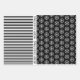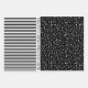 Schwarz ist weiß Schneeflocken, Weihnachtsbäume und Streifen Wrapping Paper Sheets. Ein Blatt zeigt ein niedliches Schwarz-Weiß-Muster von Schneeflocken und Streifen. Der zweite ist mit Schnee und den dritten weißen Bäumen bepflanzt. Es gibt auch den Text "Frohe Weihnachten" auf allen Blättern. Personalisieren Sie es mit Ihrem Text.