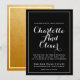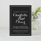 Fügen Sie Ihrer Hochzeitseinladung ein modernes, elegantes Ambiente mit einem Kalligrafiestyle-Swash-Skript auf schwarzem Hintergrund mit weißem Schrifttyp und Randüberlagerungen hinzu.
