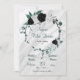Schwarz-weiße und aquamarine blaue Blumen mit romantischen aquamarin blauen Blätter botanischer Kranz auf grauem Marmor Save the Date Einladung The Glitzer Details werden simuliert