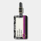 Schwarz-weißer Damast mit lila Band und einem Gepäckanhänger, mit einem eleganten, Schwarz-weißen Damast-Muster mit einem modernen lila Gradienten-Band und Herz mit goldener Kontur vorne und Ihrem Foto auf der Rückseite. Sie können das Foto löschen und weitere Informationen auf der Rückseite hinzufügen. Trendy, modern und klassisch zugleich mit einer Touch Vintag/Retro-Ambiente. Ändern Sie Text mit Ihrem Namen und Details etc. Reisen Sie mit Stil!