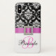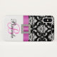Stilvolles Schwarz-Weiß-Damast-Muster mit einem DRUCKEN-Bild eines rosa Satinband, Diamantschnallen und weißen Diamanten. Personalisieren Sie dieses mädchenhafte Design mit Ihrem Namen und Monogramm Initial am unteren Ende auf einem weißen Hintergrund. Elke Clarke