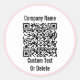 Ein Anzeigebild befindet sich in der Mitte eines weißen Kreises. Sie können das Anzeigebild durch Ihren QR-Code ersetzen. Es gibt Zeilen mit schwarzem Bildschirmtext über und unter dem Bild. Sie können den Text bearbeiten, um eine benutzerdefinierte Nachricht wie z. B. einen Firmennamen oder eine Tagline anzuzeigen. Diese Aufkleber haben schwarzen Text in einem weißen Kreis. Der Aufkleber hat einen blassrosa Rand.