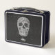 Schwarz-weißer Schädel Gothic Grunge Textur. Spooky Monogramm Lunchbox. Cooles, trendiges, modernes, beängstigendes Retro-Vintages Design inspiriert Halloween. Bildrecht Marg Seregelyi Fotografie.