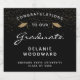 Feiern Sie den Meilenstein Ihres Absolventen stilvoll mit diesen individuellen Abschluss-Schaumweinflaschen-Etiketten, die mit den Worten "Herzlichen Glückwunsch an unseren Absolventen" in weißem Text auf schwarzem Hintergrund. Das Wort "Graduate" erscheint in einem anmutigen Skript im Handschriftenstil. Ein paar goldene Imitate Glitzer Mörtel-Kappen und eine Streuung von Goldkonfetti schmücken den oberen Teil des Etiketts. Personalisieren Sie es mit dem Namen, der Schule und dem Jahr des Abschlusses.