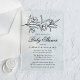 Bewundern Sie die bevorstehende Ankunft mit unserer eleganten Blumen-Babydusche. Dieses zeitlose Design zeichnet sich durch zarte schwarz gezeichnete Blume und Blätter aus, die die Oberseite elegant schmücken, Set vor einem mattierten oder transparenten Acrylhintergrund für eine moderne Touch. Persönliche Einladung mit dem Namen und Duschdetails der künftigen Mutter in klassischer schwarzer Schrift unten. Diese botanischen Einladungen sind perfekt für eine elegante und unvergessliche Babydusche und werden Ihre Gäste beeindrucken.