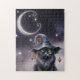 Eine schwarze Halloween-Katze mit einem ramponierten schwarzen Hexenhut gegen einen sternenhohen Nachthimmel mit einem stilisierten Halbmond oben.