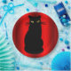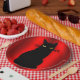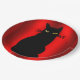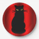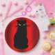 Dieses Design ist eine gruselige schwarze Katzenpapiertafel für Ihr Halloween-Entertainment. Es zeigt eine schwarze Katze mit großen gelben Augen, die aus einem blutroten Hintergrund heraus auf Sie starrt.