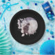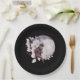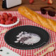 Papier Teller mit einem Aquarellbild einer schwarzen Katze und einem lila und rosa Blumenstrauß. Stehend vor einem großen Vollmond. Stilvoll und magisch.