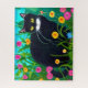 Rätsel in einem Bild einer schwarzen Katze mit auffälligen gelben Augen, die inmitten lebendiger, farbenfroher Blume in Rosa, Gelb, Rot und Blau sitzen. Das üppige grüne Grün und der helle, gesättigte Hintergrund verleihen der Szene ein lebendiges, skurriles Ambiente.