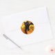 Auf einem kreisförmigen Aufkleber befindet sich eine schwarze Katze mit gelben Augen, die zwischen Kürbissen und Sonnenblumen liegt. Die Katze ist in der Mitte des Bildes positioniert, mit ihrem Körper über die Kürbis gezogen. Die Kürbis sind hellorange, die Sonnenblumen sind mit gelben Blüten und dunklen Zentren versehen. Der Hintergrund ist eine Mischung aus Kürbis und Sonnenblumen, die eine festliche und herbstliche Szene schafft. Der Aufkleber hat eine glänzende Oberfläche und die Farben sind lebendig und gesättigt.