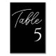 Moderne Tischnummern erheben Ihr Dekor an einem Hochzeitstisch. Das Design besticht durch einen eleganten, weißen Script-Schriftart auf schwarzem Hintergrund, der sich ideal für eine Hochzeitsfeier oder ein Bankettereignis eignet. Bestellen Sie jede Tischnummer aus der Sammlung oder bearbeiten Sie diese Karte für jede benötigte Nummer. Das Design ist beidseitig bedruckt.