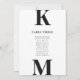 Schwarz und Weiß Moderne fette Monogram Hochzeitsstempelkarte mit Gästebamen für die Tischnummer. Alle Texte sind so vorbereitet, dass Sie sie einfach und schnell mit Ihren eigenen Details personalisieren können.