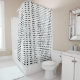 Schwarz-Weiß-Duschvorhang mit schwarzen Polka-Punkten, die einen gestempelten Effekt haben. Cooles Design für Ihr modernes Bad.