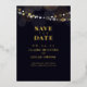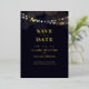 Ein lustiger und festlicher Save the Date mit schwarzem Hintergrund mit Saitenbeleuchtung, Text in Gold Foil.