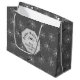 Dieses Black Spiderwebs Happy Halloween Große Geschenktasche verfügt über handgezeichnet Spinnen und Spinnennetze auf dunkelgrauem Hintergrund mit einem klassischen Hexagon-Rahmen auf beiden Seiten, der "Happy Halloween" und Ihren Familiennamen zeigt.