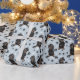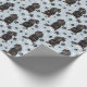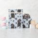 Ein Bild eines kleinen Schwarz-Bein-Dackel-Hundes ist das Merkmal dieses jedes Anlasses Geschenkpapier. Der Hund sitzt inmitten eines Musters aus schwarzen Pfoten und weißen Knochen und wird auf einem silberblauen Hintergrund wiederholt.