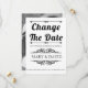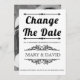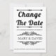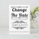 Vintage Elemente und Schwarz-Weiß-Typografie Hochzeit Ändern Sie die Datum Verschiebung Ankündigung. Dieses elegante Hochzeitsdesign zeigt den Text "Datum ändern" in fett schwarzer Typografie und Vintagen Elementen, die Rahmen für den Text bilden. Auf der Rückseite befindet sich ein Foto des Paares.