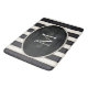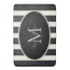 Diese individuelle Badmatte hat ein hellgraues Monogramm in einem ovalen Rahmen auf einem Hintergrund von breiten Streifen in schwarz und antiken Weiß.