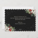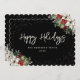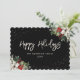 Schwarze Happy Holidays Karte mit einem Schneerahmen, der mit weißer Poinsettia, heiligen roten Beeren und anderen Grünpflanzen geschmückt ist. Personalisieren Sie diese elegante Urlaubskarte einfach mit Ihrem Text.