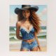 Diese Strandverkleidungskünstlerin verfügt über eine braunhäutige, rot-haarige afrikanische junge Frau mit einem Denim-Outfit und einem schwarzen Cowboyhut. Sommerstrand und Western Ästhetik verbinden sich mit sonnengeküsster Melaninschönheit in diesem schwarzen Girl Porträtmalerei.