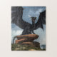 An einem bewölkten Tag, an dem der dunkle Himmel den Regen bedroht, sitzt ein riesiger schwarzer Drache auf einem Stapel von Steinen. Seine Flügel breiteten sich aus und seine Zähne sind gebrannt, dieses Monster von Fantasie, Mythos und Legende blickt mit erbittertem Ausdruck auf Sie herab.
