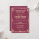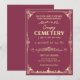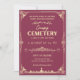 Die Einladung zeigt ein Vintag inspiriertes Design mit dunkelrosa Hintergrund und pfirsichorangefarbenem Text. Das Layout ist symmetrisch, mit einem zentralen Bild eines gruseligen Friedhofs, der durch verzierte Ränder gerahmt ist. Fledermäuse, Schädel und andere spukhafte Elemente sind im gesamten Design verstreut und ergänzen das Halloween-Thema. Die Ästhetik ist elegant und unheimlich und schafft ein Gefühl der Vorfreude für die Veranstaltung.