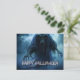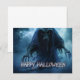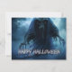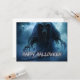 Ein düsterer, schwebender schwarzer Geist mit ätherischer Form, umgeben von dichten Nebelwolken, der bedrohlich über dem Boden in einer dunklen, hellischen Landschaft mit einer unheimlichen Atmosphäre schwebt. Happy Halloween