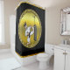 Schwarzer Gürtelkarate, der eine schwarze Trainingstasche kickt. Dieser Cartoon zeigt ihm, dass er aggressiv mit Beinschlag im Fitnessraum ist. Lass dieses unterhaltsame, humorvolle Kinderdesign redet für dich. Mit goldener Folie und schwarzer Textur hinten gemahlen.