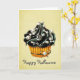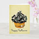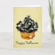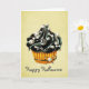 Niedlicher Halloween-Entwurf - kleiner Kuchen mit schwarzer Creme und Losen kleinen Schädeln und Knochen in ihr. Zum Zusatz kleines Schädel-Button befestigt zum Band. Bestimmt netter Halloween-Nachtisch für irgendein Party "des Tricks oder der Leckerei".