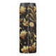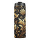 Diese Wasserflasche hat einen schwarzen Hintergrund und ein goldenes Blattwerk mit Vögeln, Blätter und Blume.
